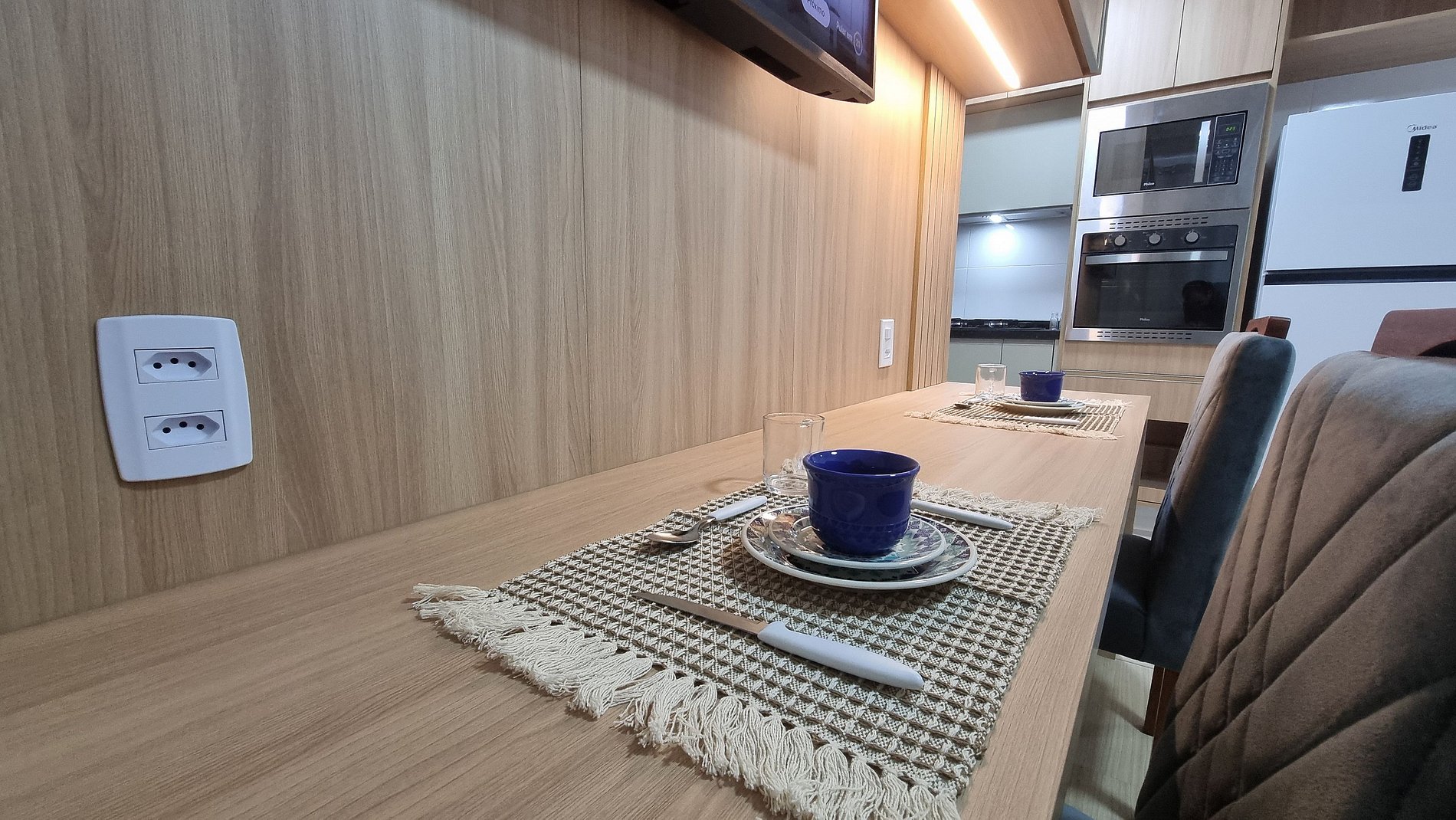 - Design moderno com cozinha integrada;